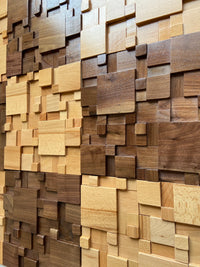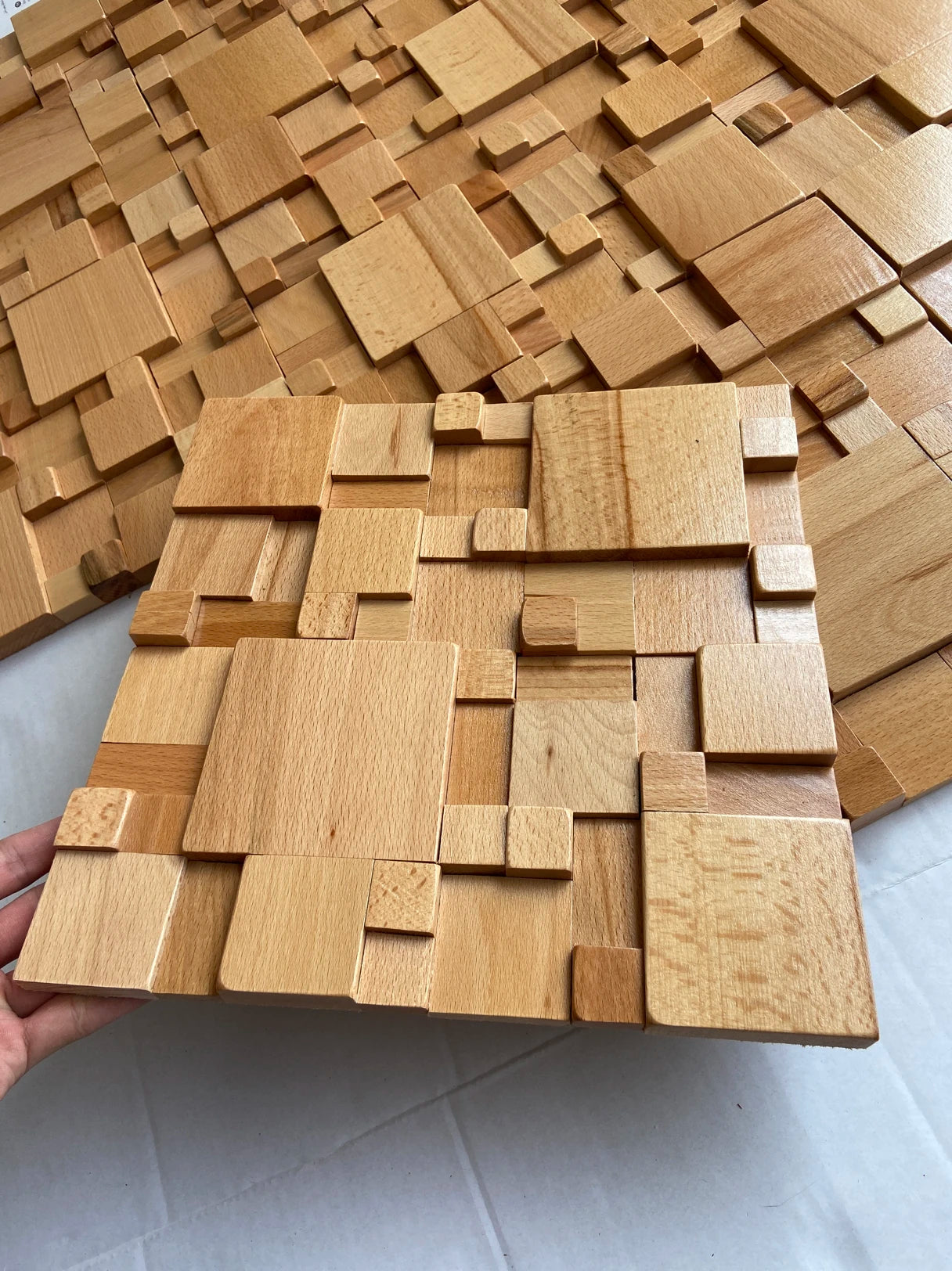 Te minimalistyczne panele ścienne z mozaiką wykonane są z litego drewna bukowego i orzechowego i łączą naturalne piękno z właściwościami dźwiękochłonnymi . Idealne na ścianę pod telewizor , do salonu , butikowego hotelu lub luksusowego projektu wnętrzarskiego. Geometryczna faktura mozaiki doda charakteru Twojej ścianie, a drewno nada jej ciepły i stylowy wygląd.